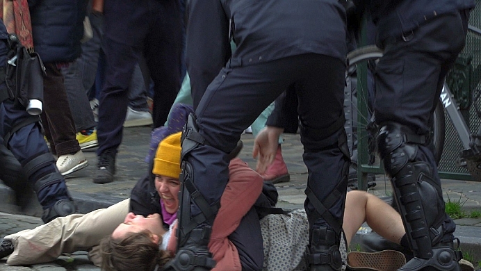 Abortusactivisten probeerden door zich aan elkaar vast te klampen een blokkade te vormen tegen de Mars voor het Leven. Dankzij optreden van de Brusselse politie slaagden zij daar niet in. (Foto: Stirezo)